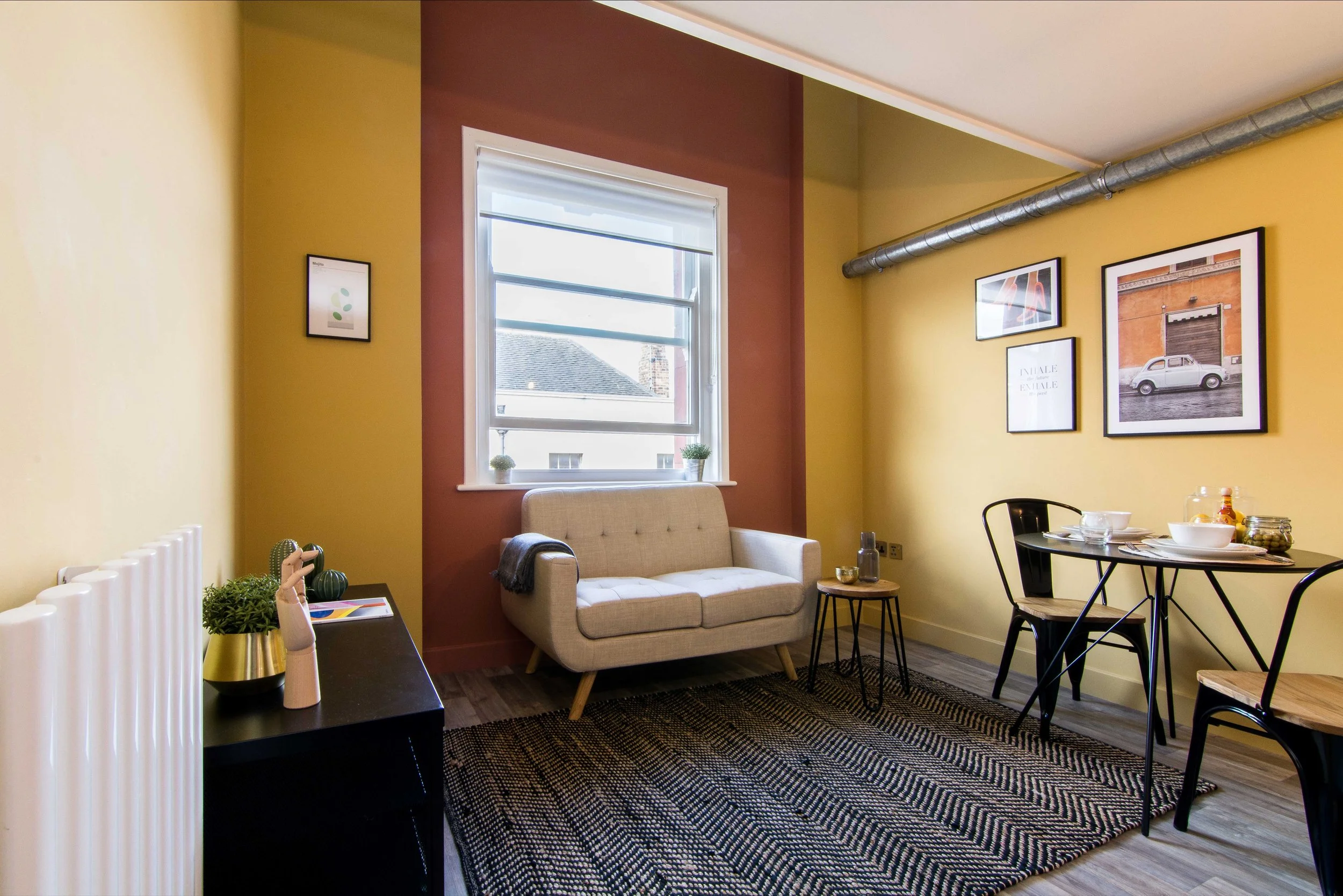 The Mar503 project saw a complete transformation from a grey 1-bed studio flat to a warm Mexican Barragan-inspired vibe. We upgraded all finishes and electrics, installed a new ensuite, and carefully selected furniture, art, and styling to complement the theme.